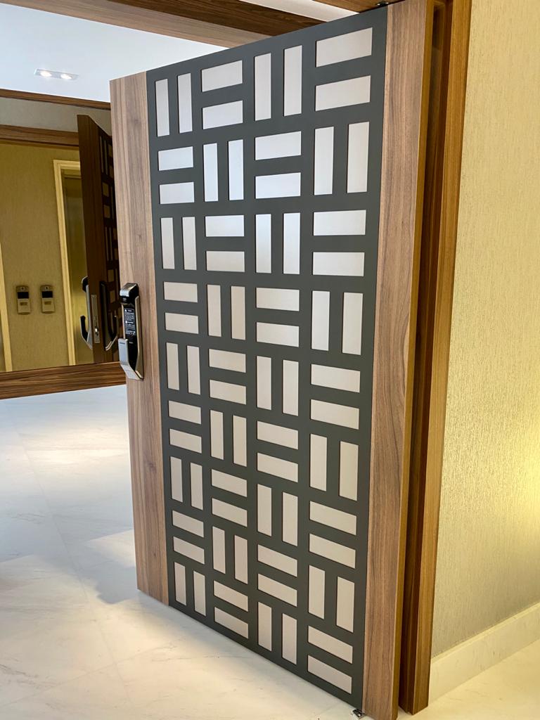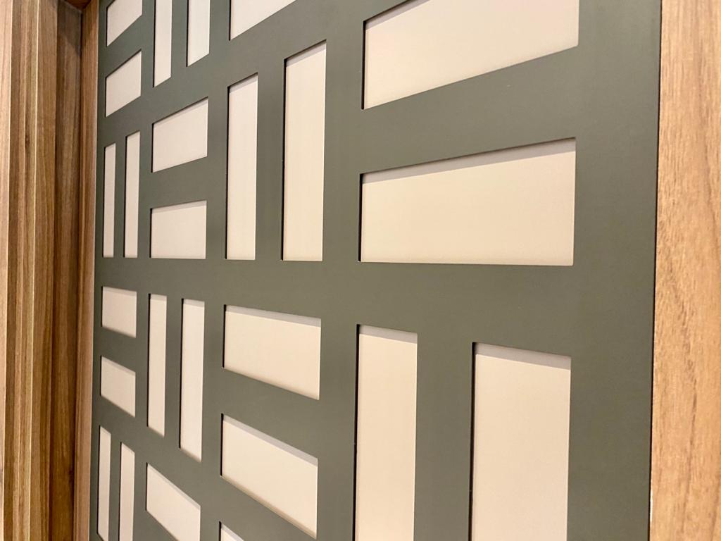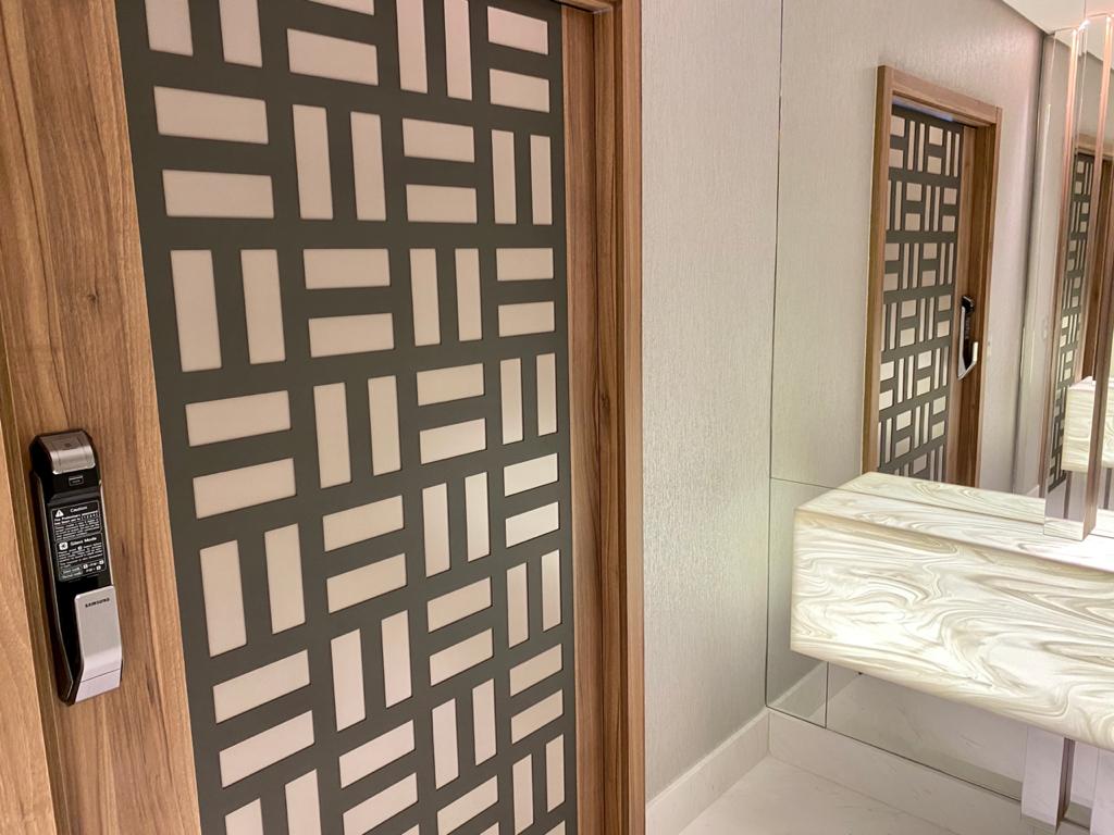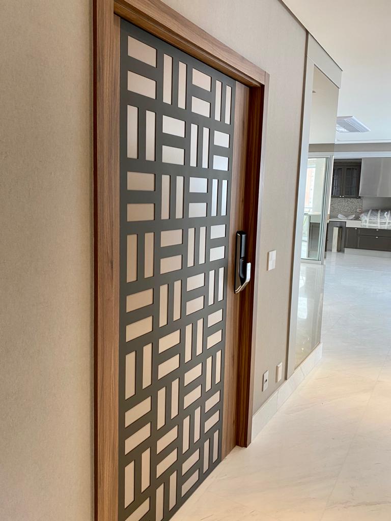 Nesse projeto da Adriana Di Garcia, fizemos a instalação dos paineis perfurados da PainelArt, colado na porta de hall de entrada de edifício, nas faces interna e externa. O design escolhido é o Zaria, na cor cinza acetinado.