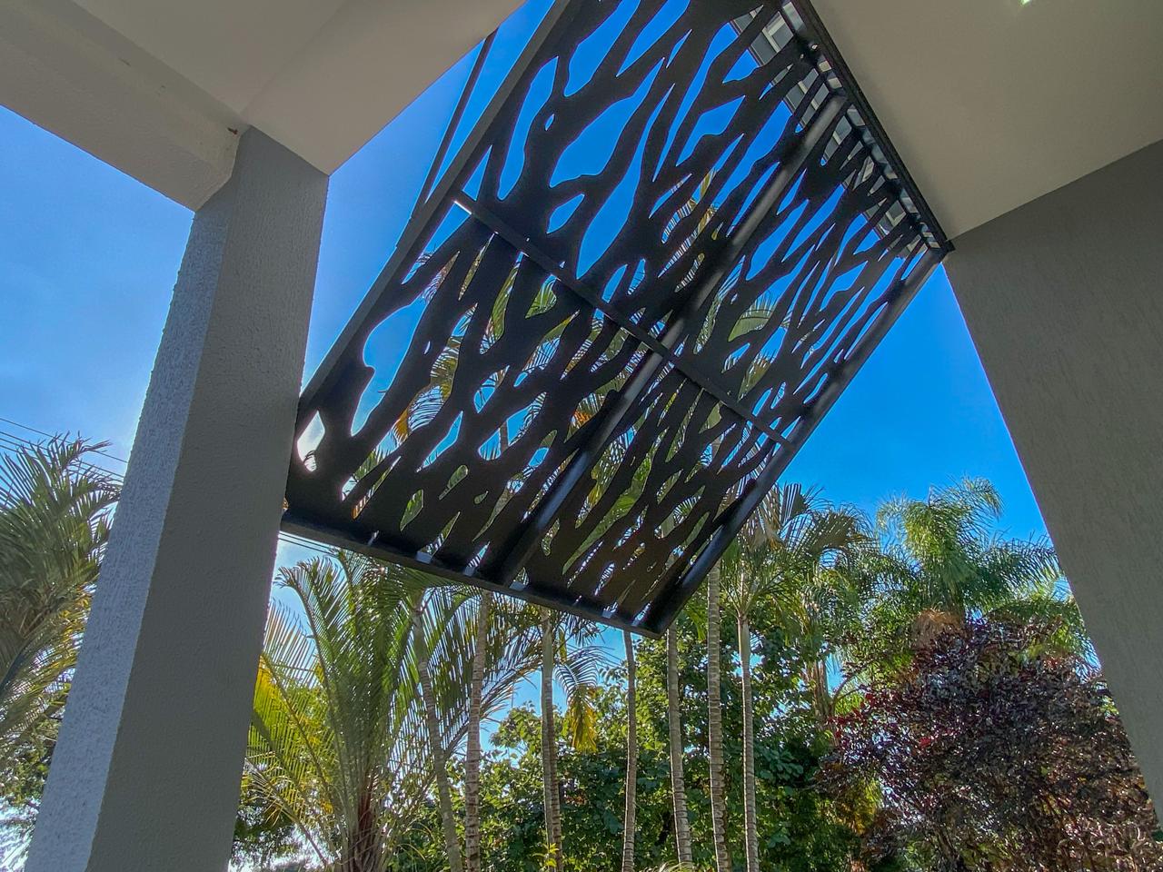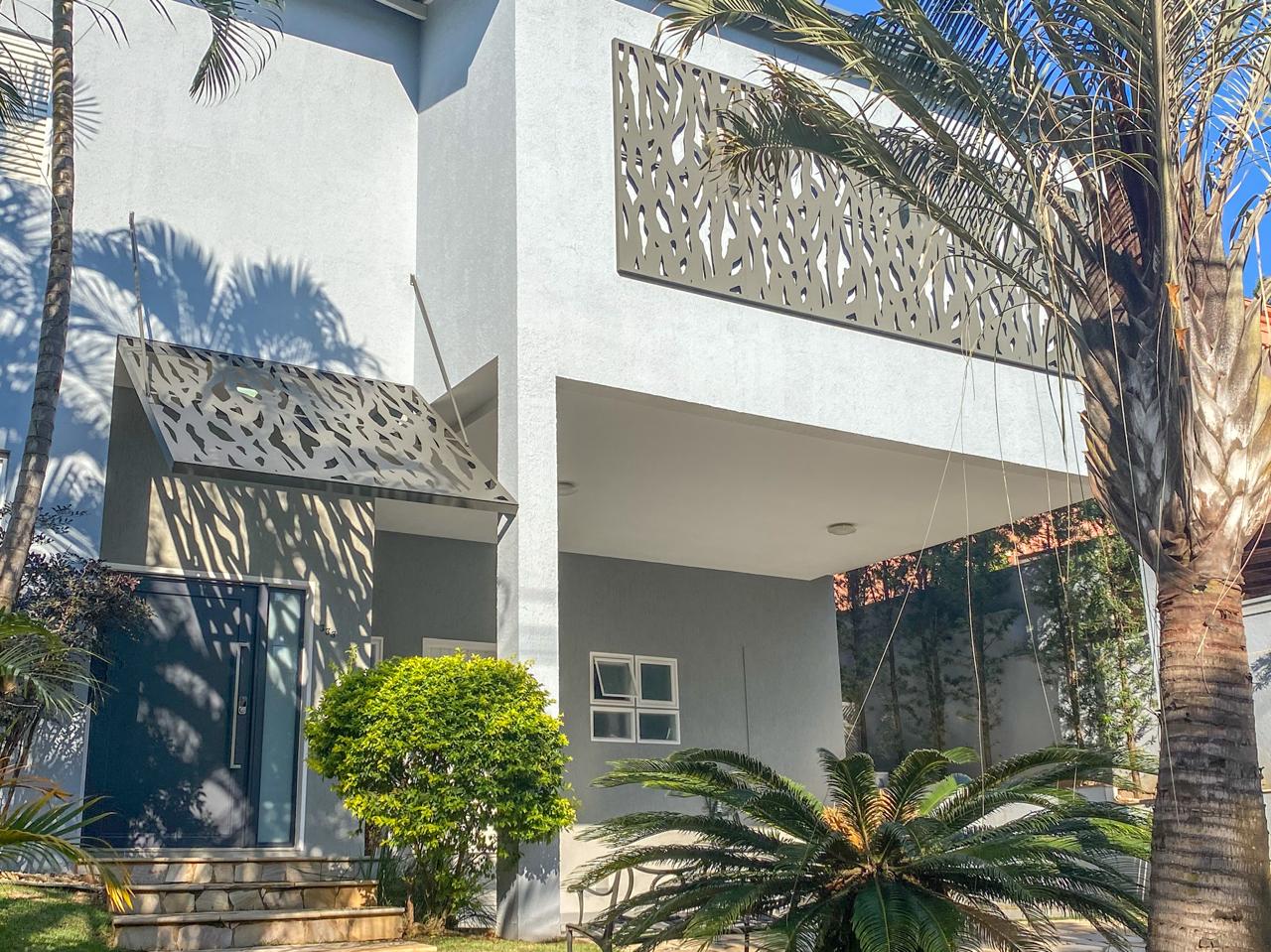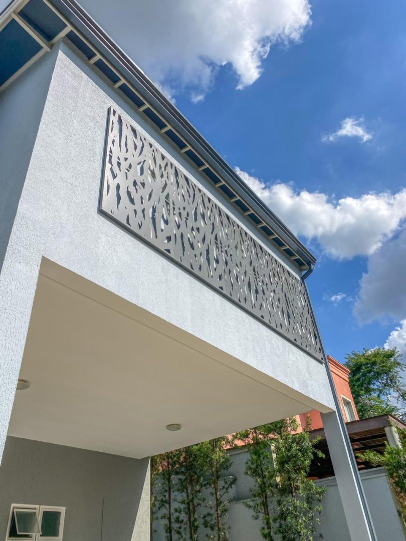 Neste projeto de fachada com painel perfurado foi escolhido o design raízes para trazer mais estética e ocultar as janelas, funcionando também como brise para reduzir a incidência do sol no interior dos aposentos. Além disso, a aplicação do painel como sombra para a porta de entrada.