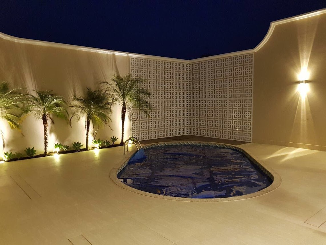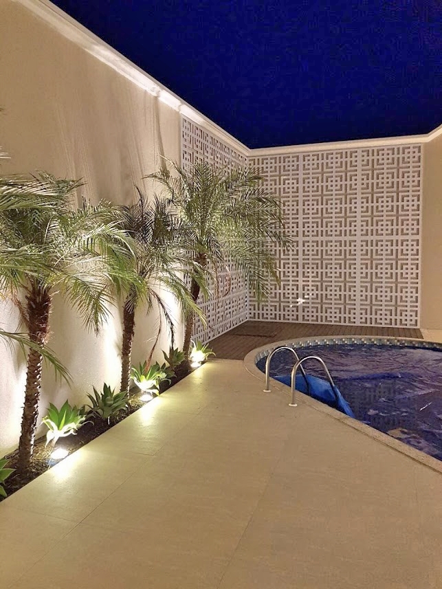 Home Projetos Decorativo Miami Miami Projeto de revitalização área da piscina, design de interiores Carol Marques. Painel em alumínio pintura eletrostática branca com bordas dobradas. Residência em Promissão/SP. Acompanhamento Promad Acabamentos.