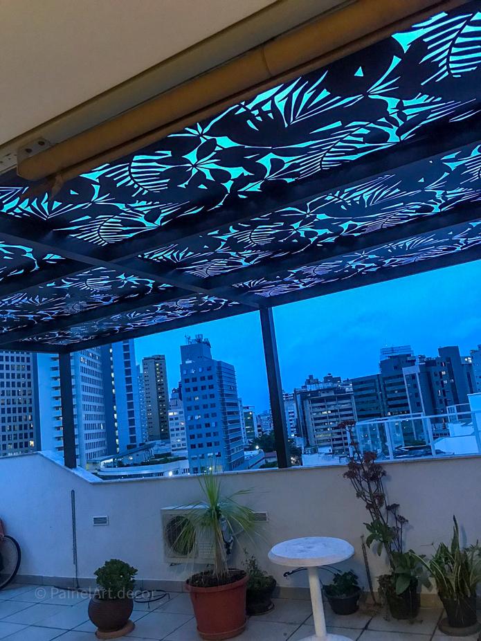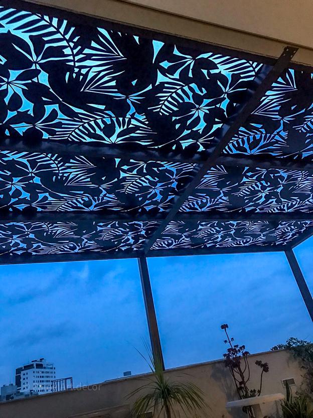 Painel Perfurado para sombra em cobertura em prédio, promovendo menor entrada de luz e calor e transformando o ambiente com charme e funcionalidade. O design escolhido foi o Hawai, com desenhos que simulam plantas.
